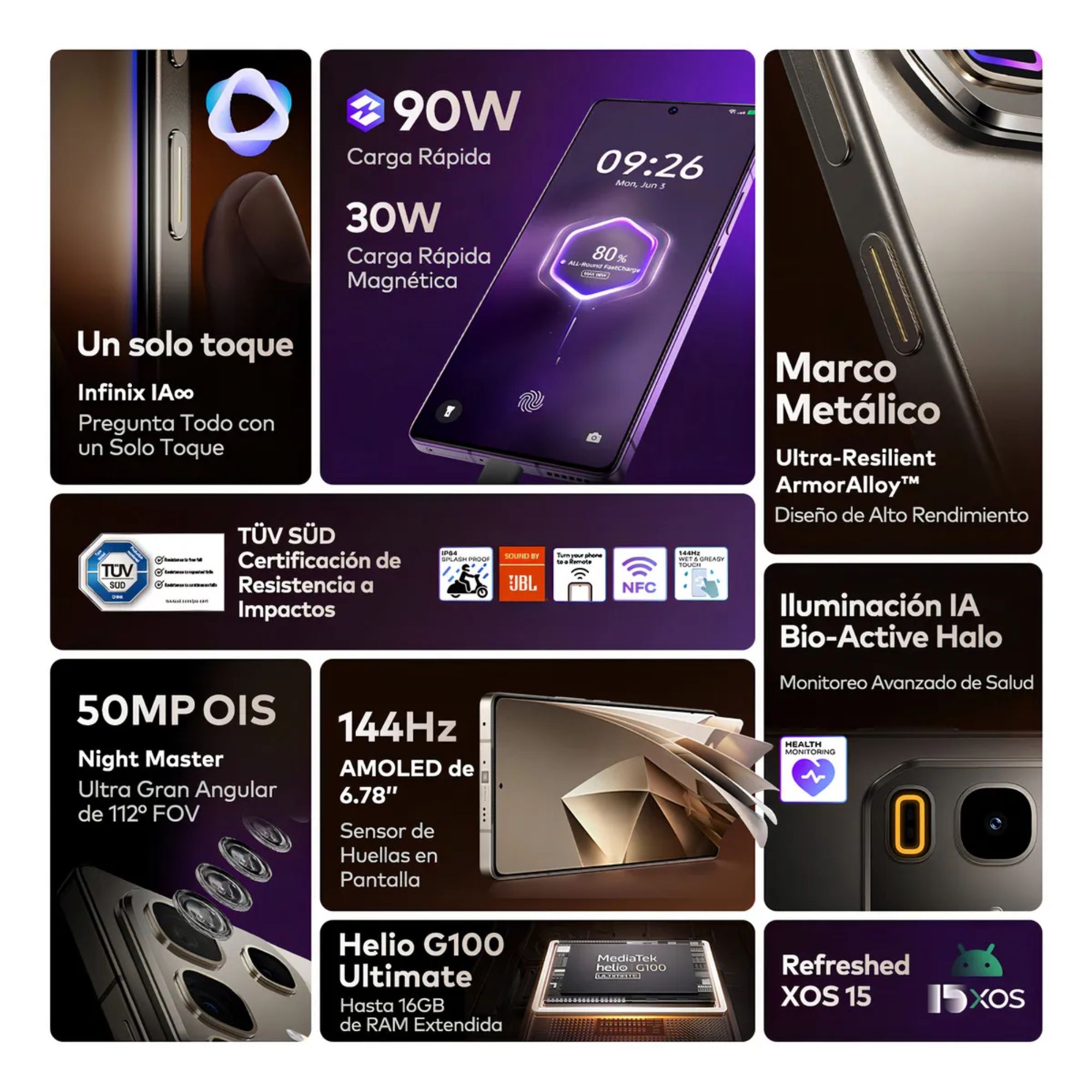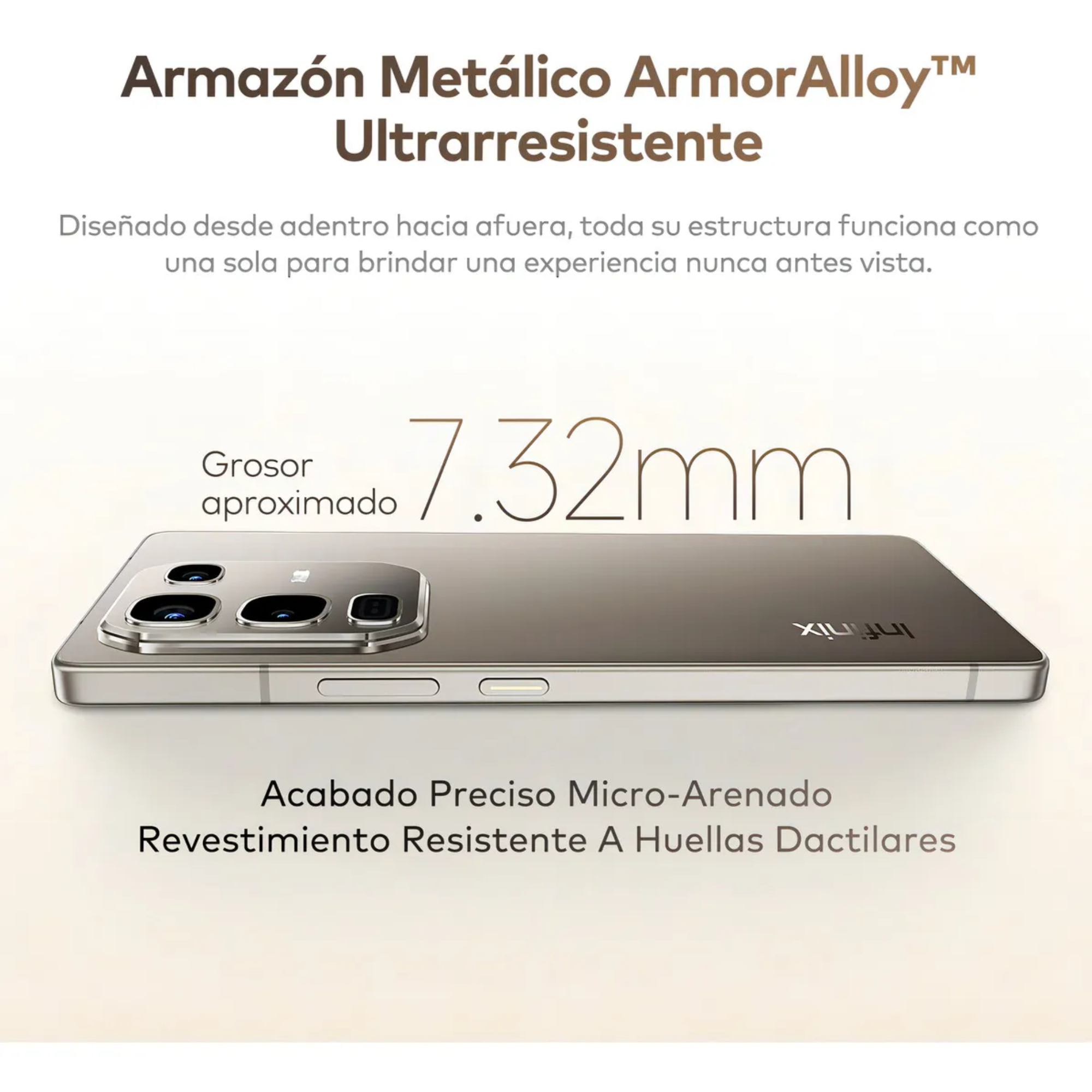 - Diseño elegante con marco metálico ArmorAlloy, resistente y sofisticado.